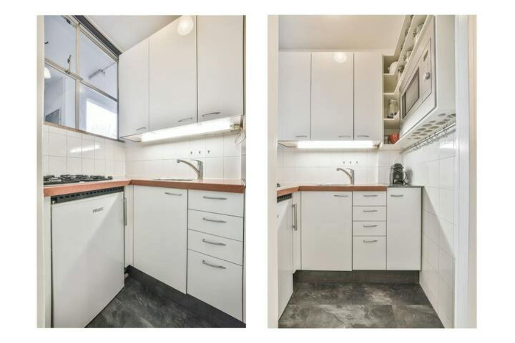The studio is located on the third floor that can be reached through the stairs or an elevator. Upon entering the hallway there is a small kitchenette on the left hand. The kitchenette has a stove, fridge, sink and is fully equipped to cook. Next stop is the bathroom. Strong rain-shower, toilet and sink. After this you enter through a door the living and sleeping area. The sleeping area has a very comfortable bed (you can challenge me on that), large mirror (180 x 70) and a comfortable chair. The living area has a nice couch, large table with bench and chairs. There is also a large build-in closet.