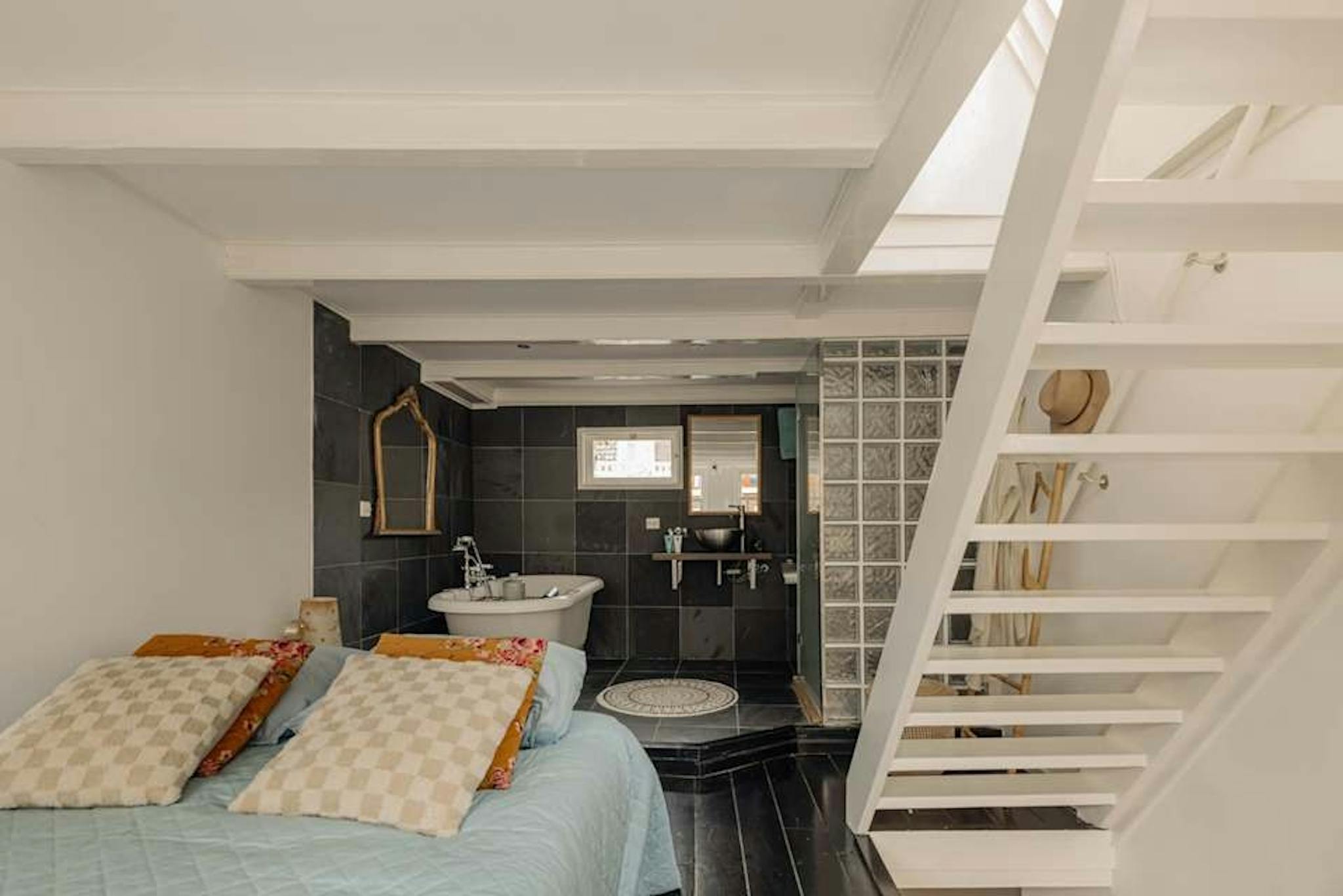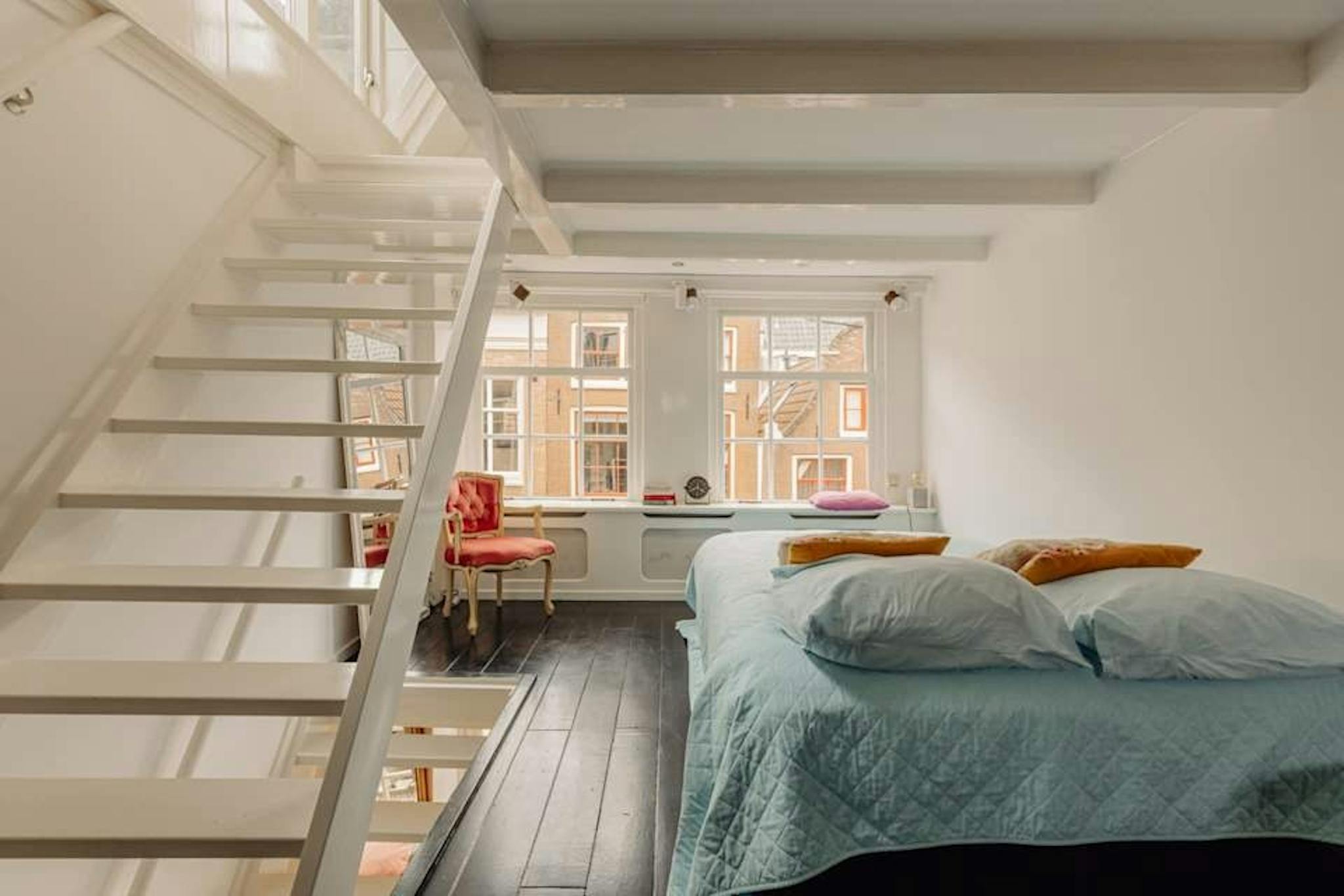The second floor is the main living area, boasting an open-plan modern kitchen with dining space and a living room filled with natural light and charming city views. Upstairs on the third floor, you’ll find a cozy bedroom with an en-suite bathroom that includes a bathtub, separate shower cabin, washbasin, and an additional toilet. The attic provides a flexible space for a second bedroom, home office, or creative studio, offering stunning views over the Prinsengracht and Looiersgracht canals.