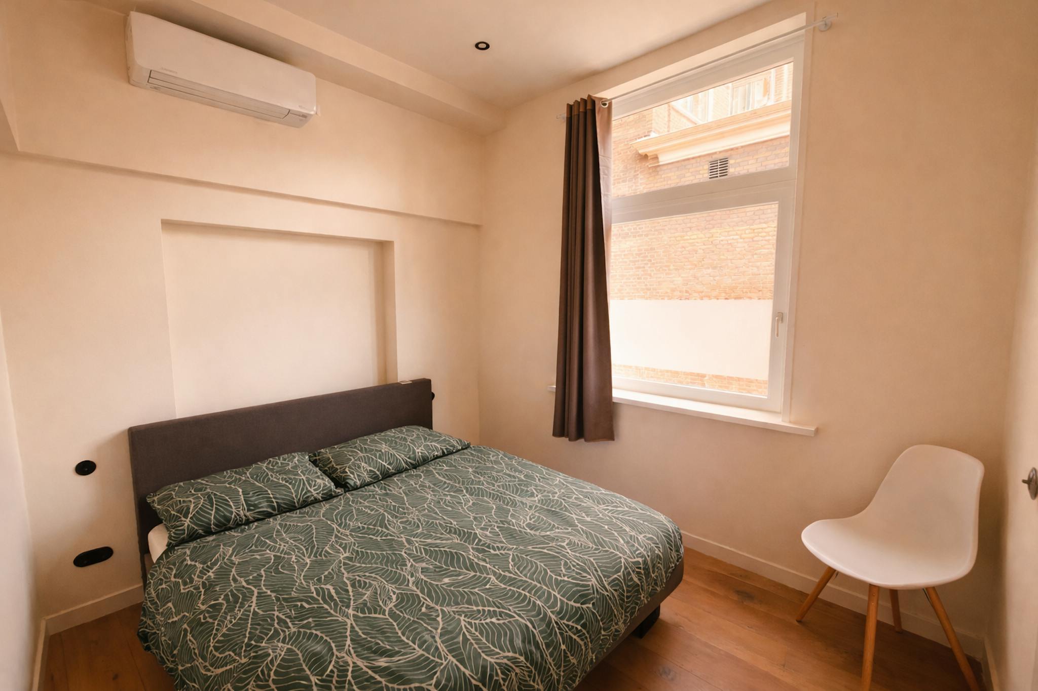 The apartment is finished with a high-quality floor, underfloor heating, and air conditioning.