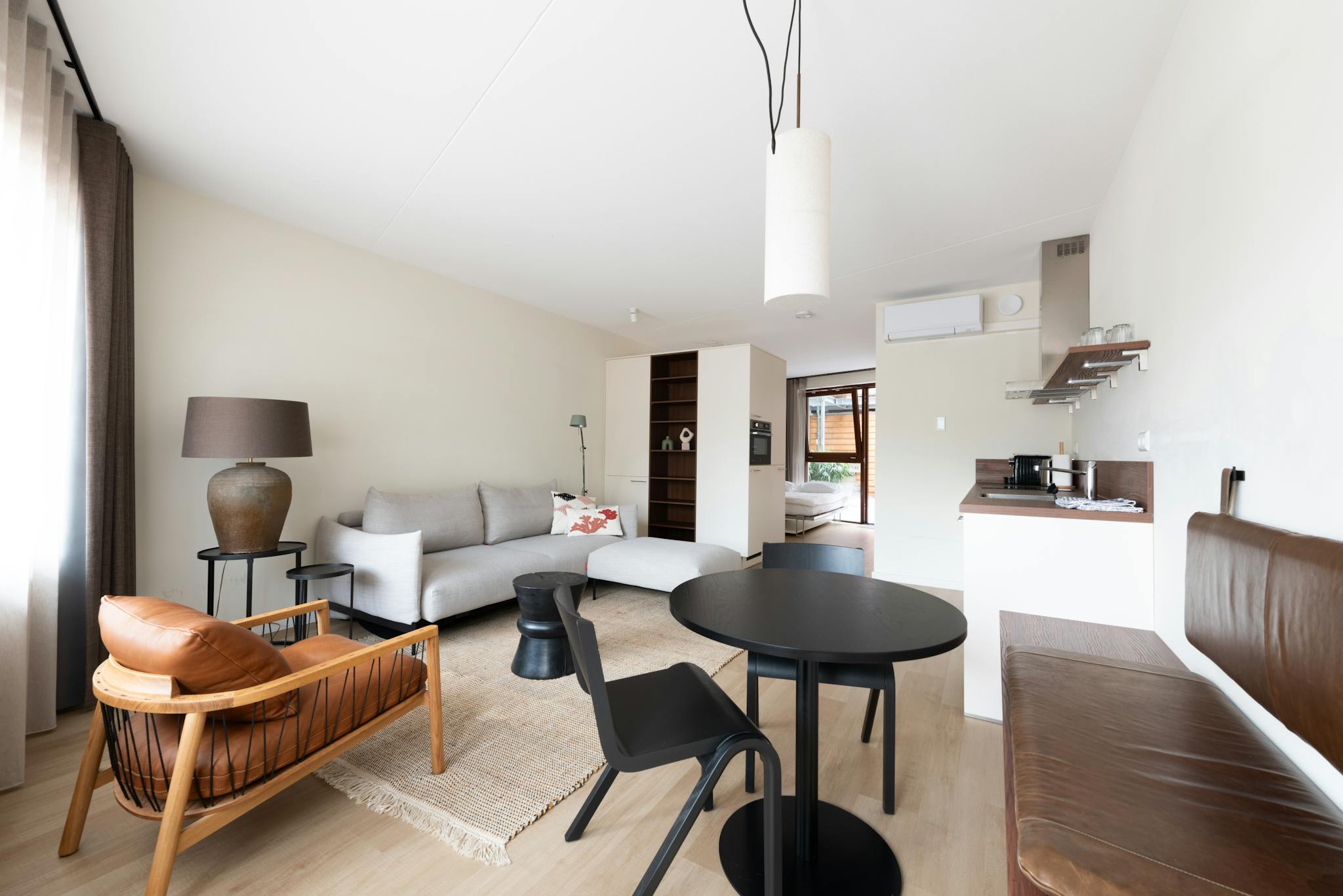The building is very sustainable and environmentally friendly. Your studio can cool and heat itself with the Airconditioning installed. The energy used comes from the solar panels on the rooftop. The design of this property has a very modern approach, giving it a very chic appearance. The Scandinavian interior ensures plenty of brightness and light in the studio. The space is cleverly divided by using a desk bed. This piece of furniture functions when unfolded as a bed (160x200) and folded as a desk to save space.