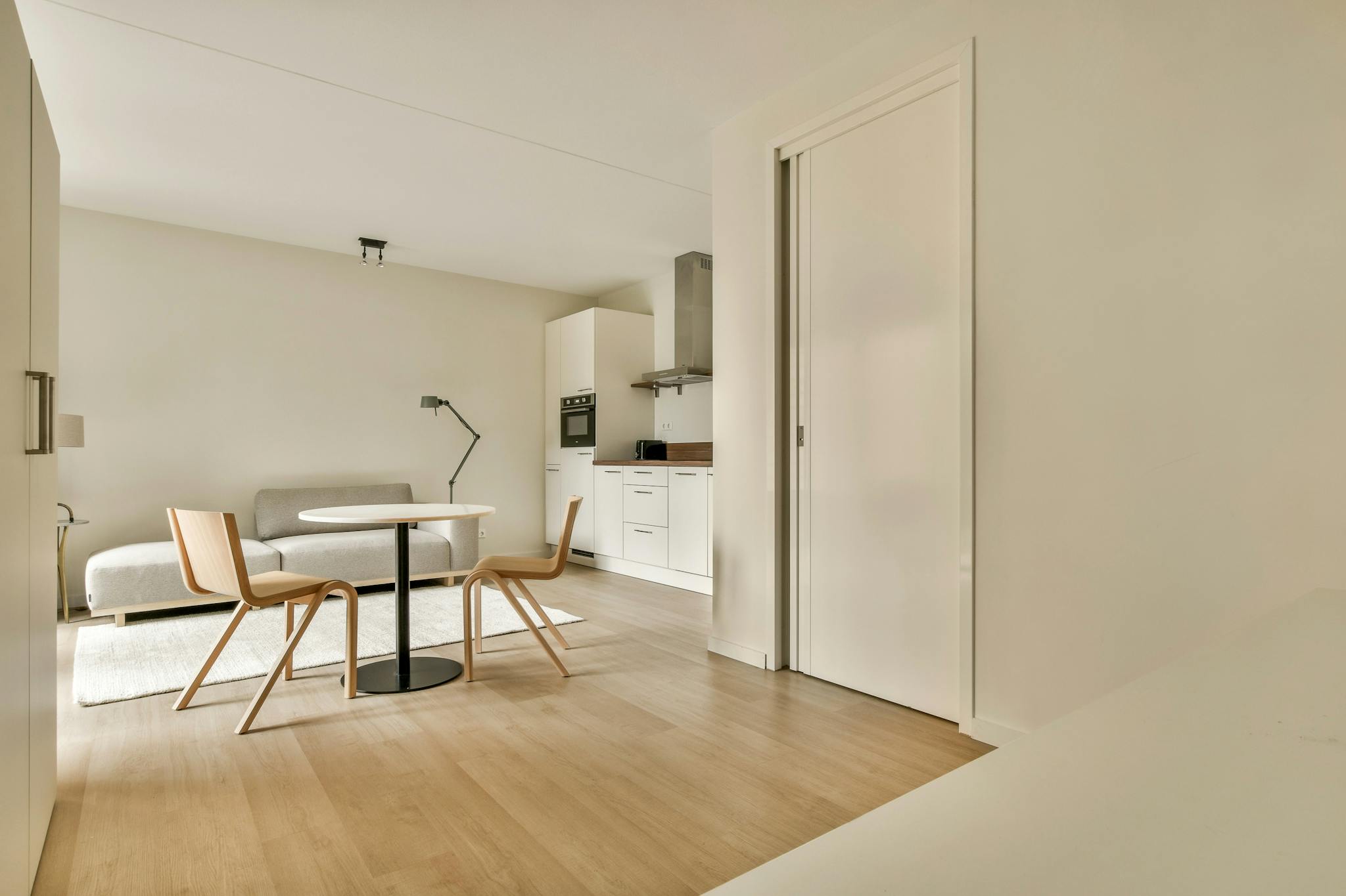This beautiful ground-floor studio of 35 square meters is located directly adjacent to the inner garden of the apartment complex. When you open the French doors, you can sit right in the lovely garden. The studio itself is fully equipped and has a foldable bed of 160x200 cm. When folded, this piece of furniture functions as a desk, and when unfolded, it serves as a double bed. Additionally, the studio also has a dining table with two chairs, a sofa, and a wardrobe. The kitchen is also fully equipped, and the bathroom offers space for a toilet and a walk-in shower.