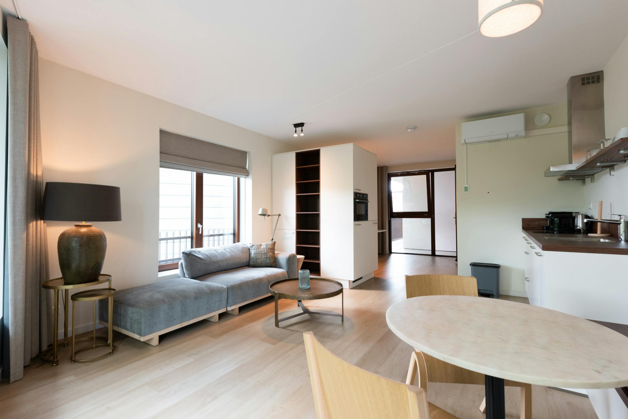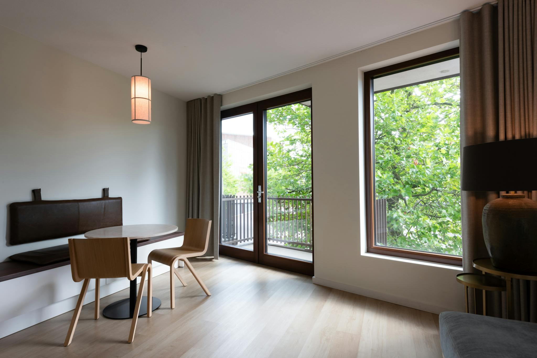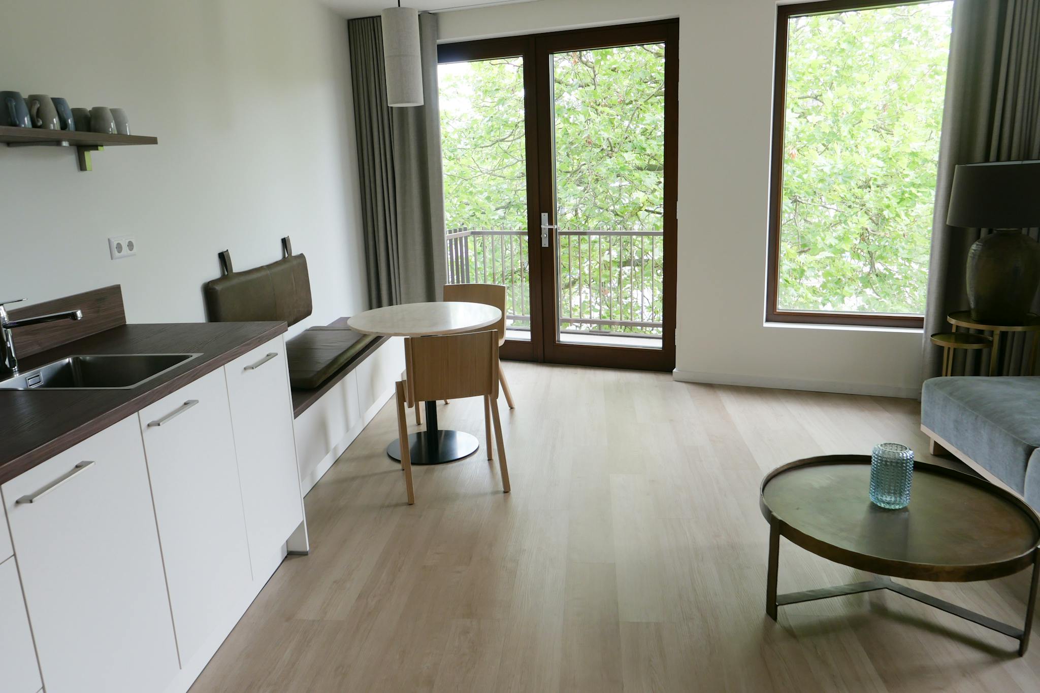 The corner homes are all located on a corner. This creates a playful space with lots of light. They have a nice living area with a sofa including a footstool and this living area is separated by a built-in wardrobe from the sleeping area. All corner apartments also have a balcony facing the front of the building.