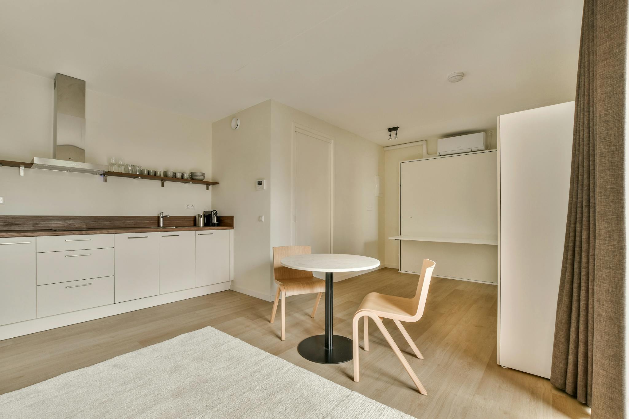 The studio is fully furnished and has a foldable double bed. When folded, it functions as a desk where two people can comfortably work or study. After a long day of work, you can relax on the sofa or prepare a delicious meal in your own kitchen and enjoy it at the dining table. The studio also has a fully equipped bathroom with a shower and toilet, in short, everything you need for a pleasant stay!