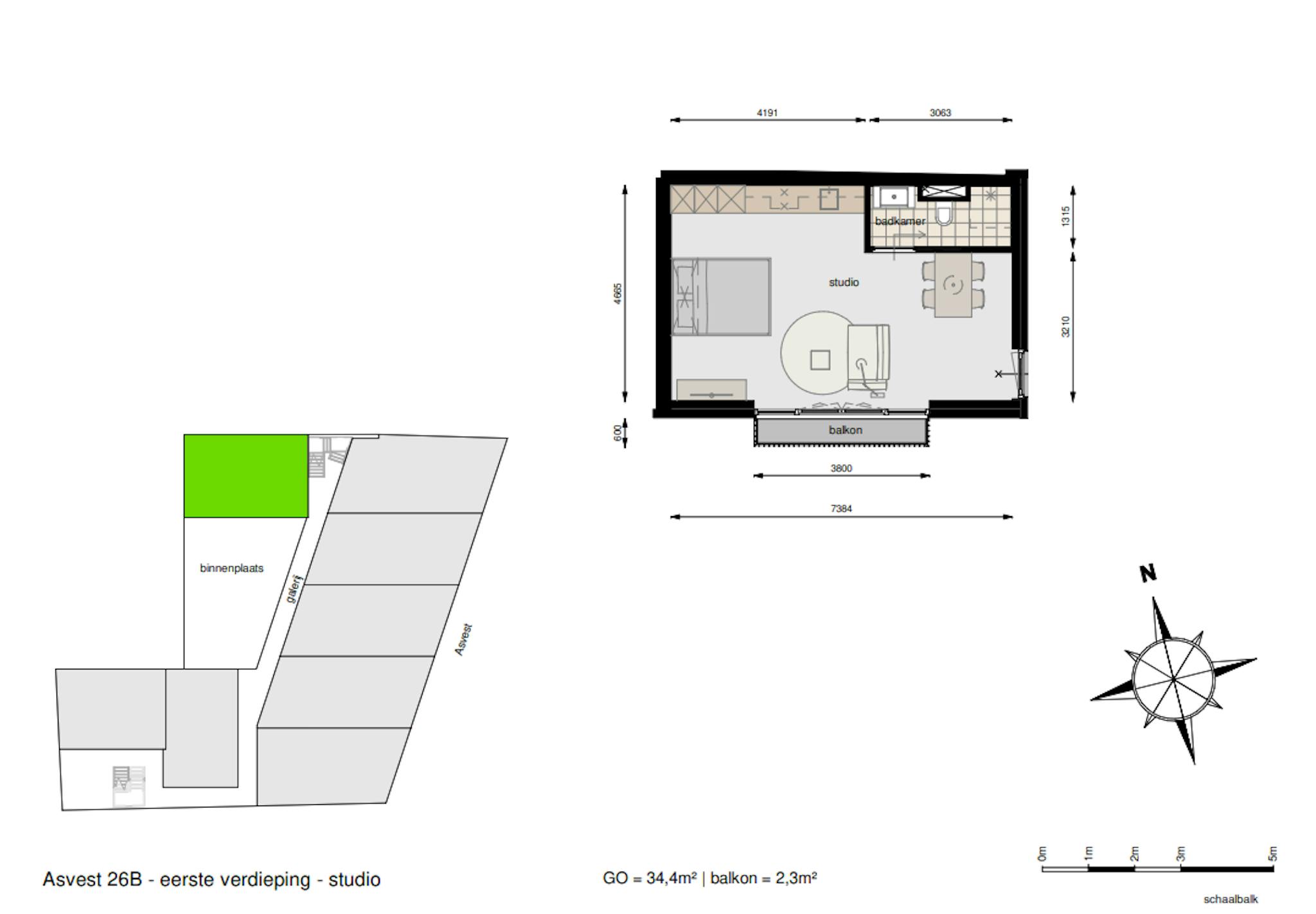 This studio on the first floor of the building complex is 35 square meters in size and also has a 2.3 square meter balcony. The view from the studio overlooks the inner garden of the building. in short, green living in the heart of bustling Delft.