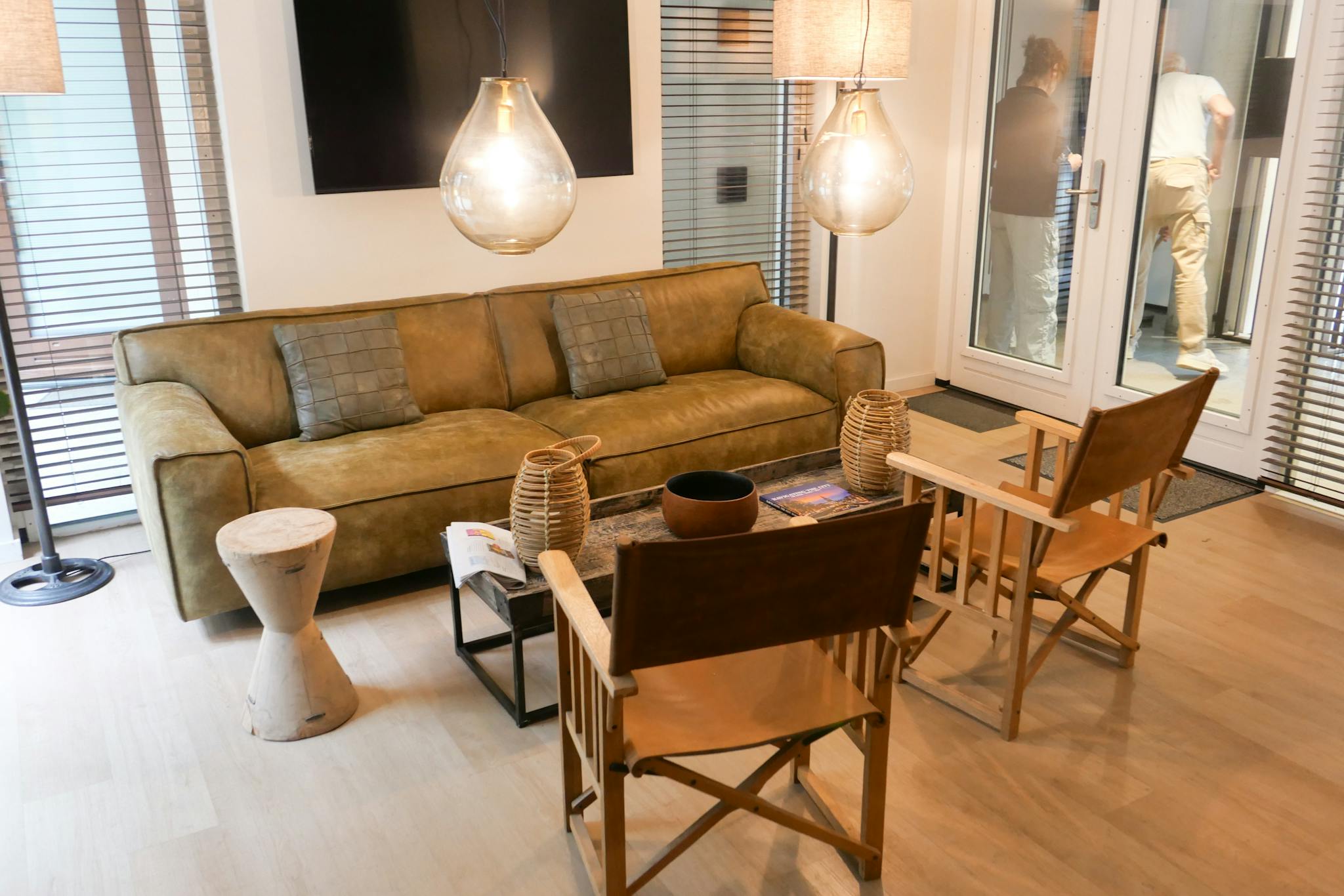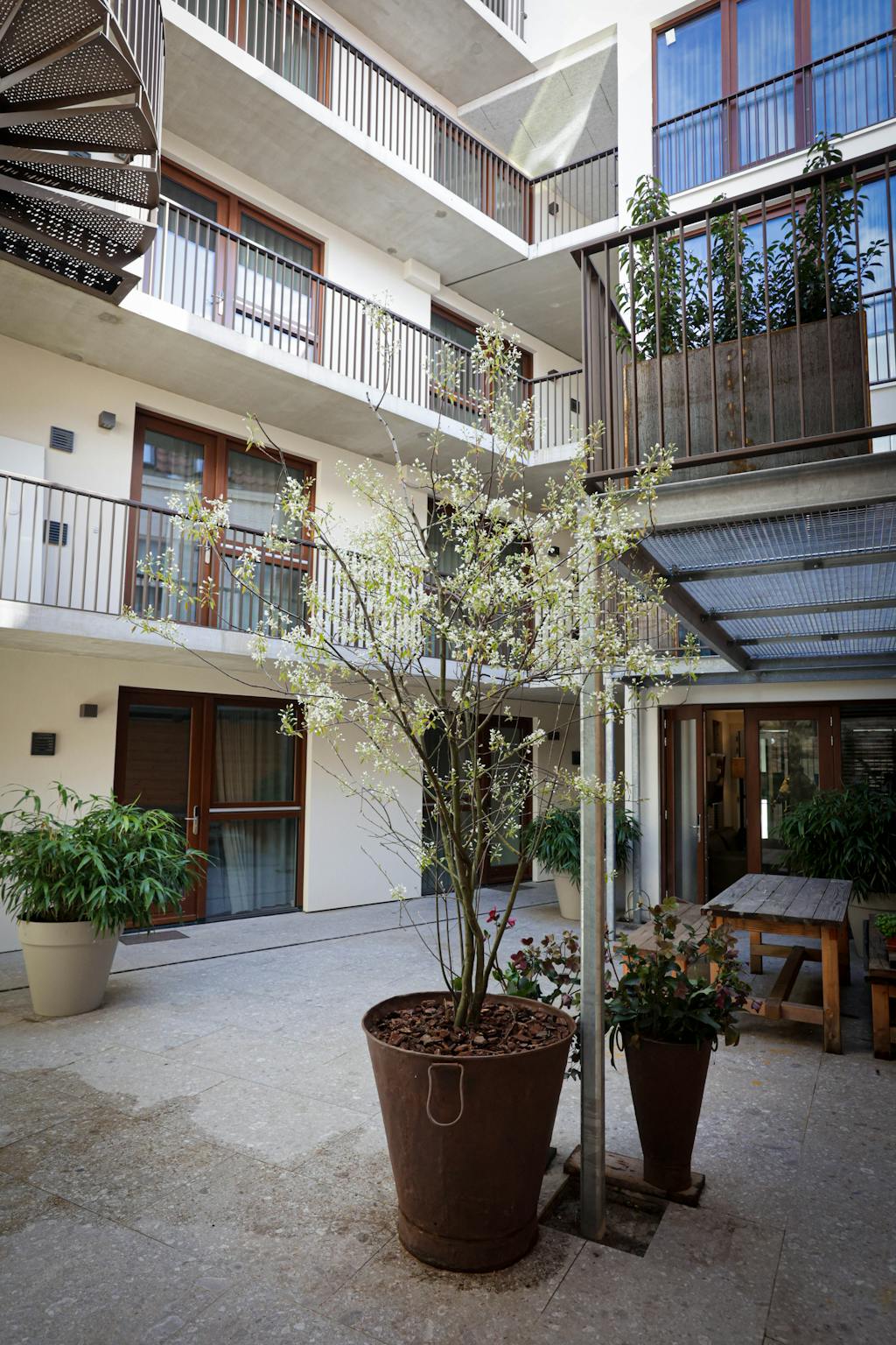 When you enter, there is a large built-in wardrobe on your right where you can store all your personal items. There is also a bathroom with a walk-in shower and a separate toilet. Furthermore, the first floor is spacious and offers plenty of space to work at the desk and sleep. When you take the spiral staircase up, you enter a bright, beautiful space with an L- shaped kitchen equipped with everything you need. There is also a large comfortable sofa and you can open the patio doors or relax on your south-facing balcony overlooking the courtyard.