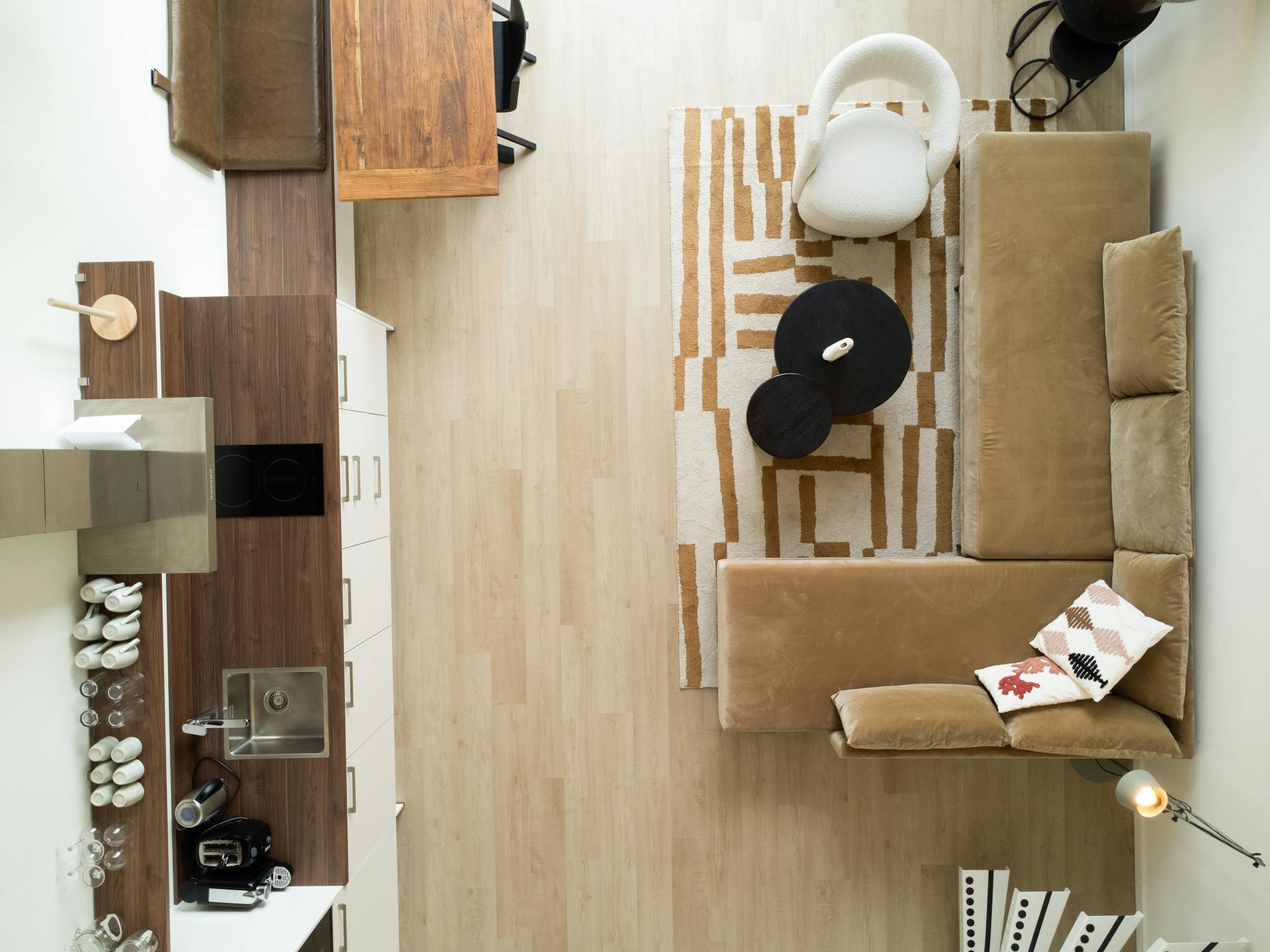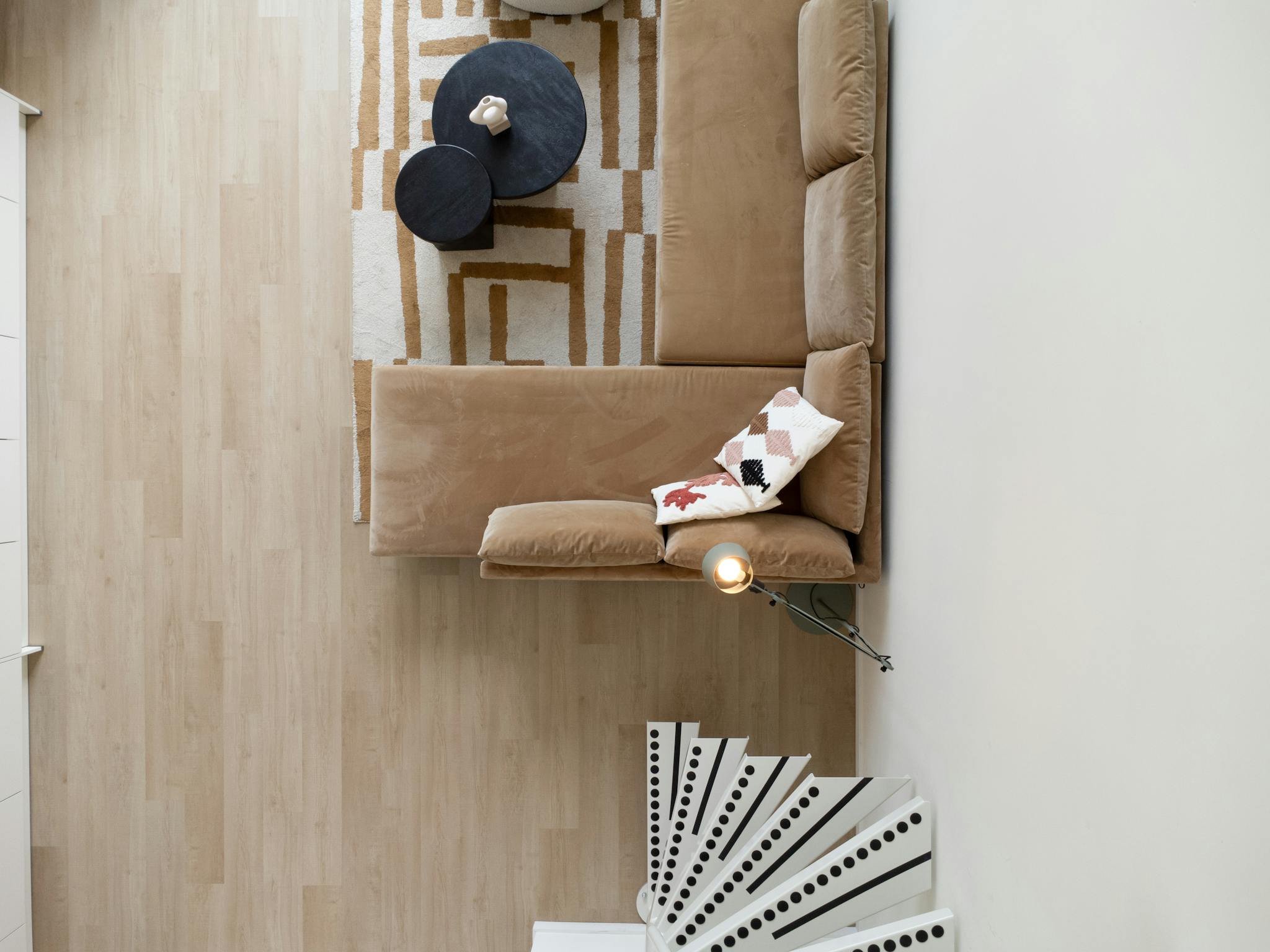 The design of this property has a very modern approach, giving it a very chic appearance. The Scandinavian interior ensures plenty of brightness and light in the studio. The space is cleverly divided. On the first floor of the loft, you can find your private kitchen, bathroom, and living room as well as the balcony. If you take the stairs, you can view from the upper floor down and enjoy an amazing view. The upper floor is the bedroom of the apartment and is also provided with a desk and closet.