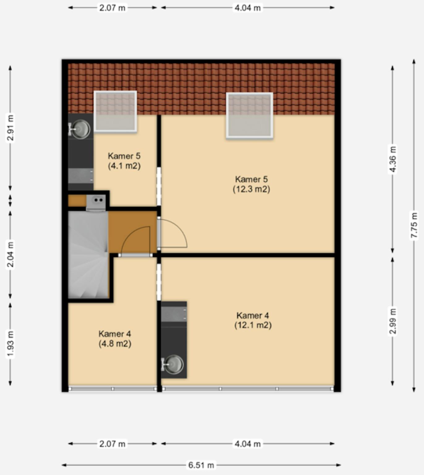 - Kamer 5: 16,4 m2, huur €812,- per maand, excl. voorschot g/w/l en meubilering