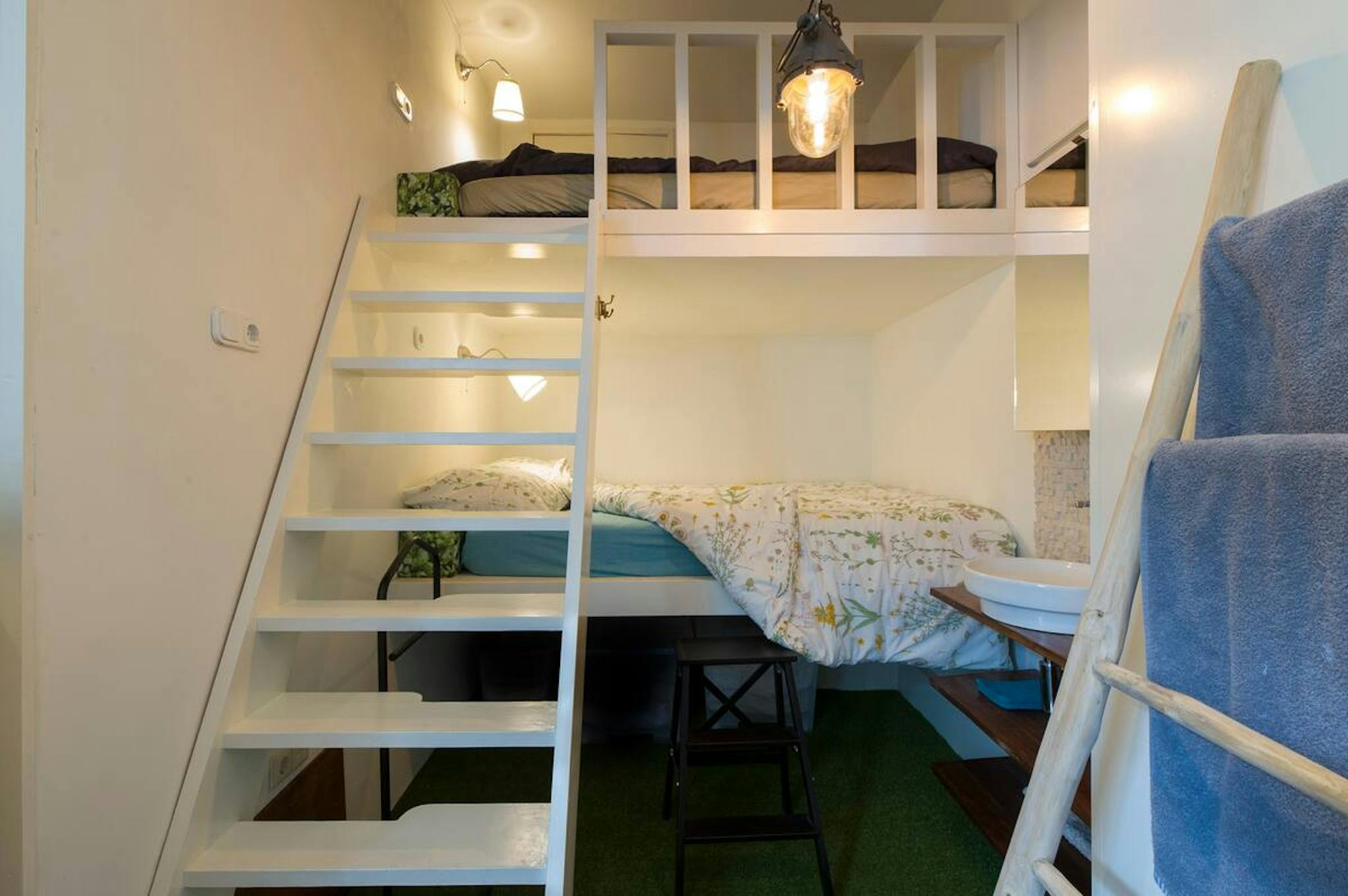 Het appartement bestaat uit één ruimte. De knusse hoog- en laagslaper kan afgesloten worden door gordijnen. Formaat van de bedden is 220 x 140 cm.