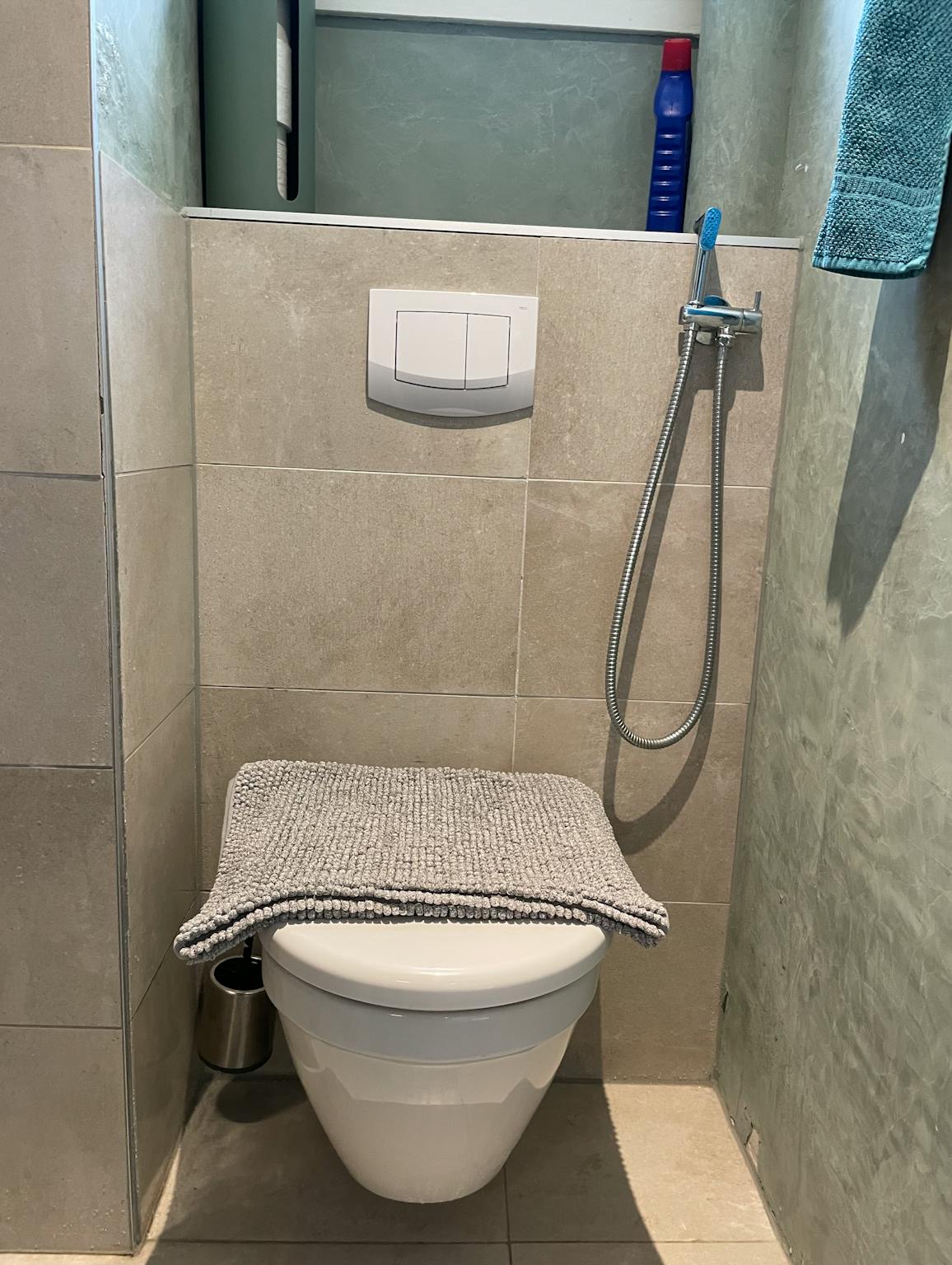 De compacte badkamer met regen- en handdouche is voorzien van een toilet en een bidet-douche.