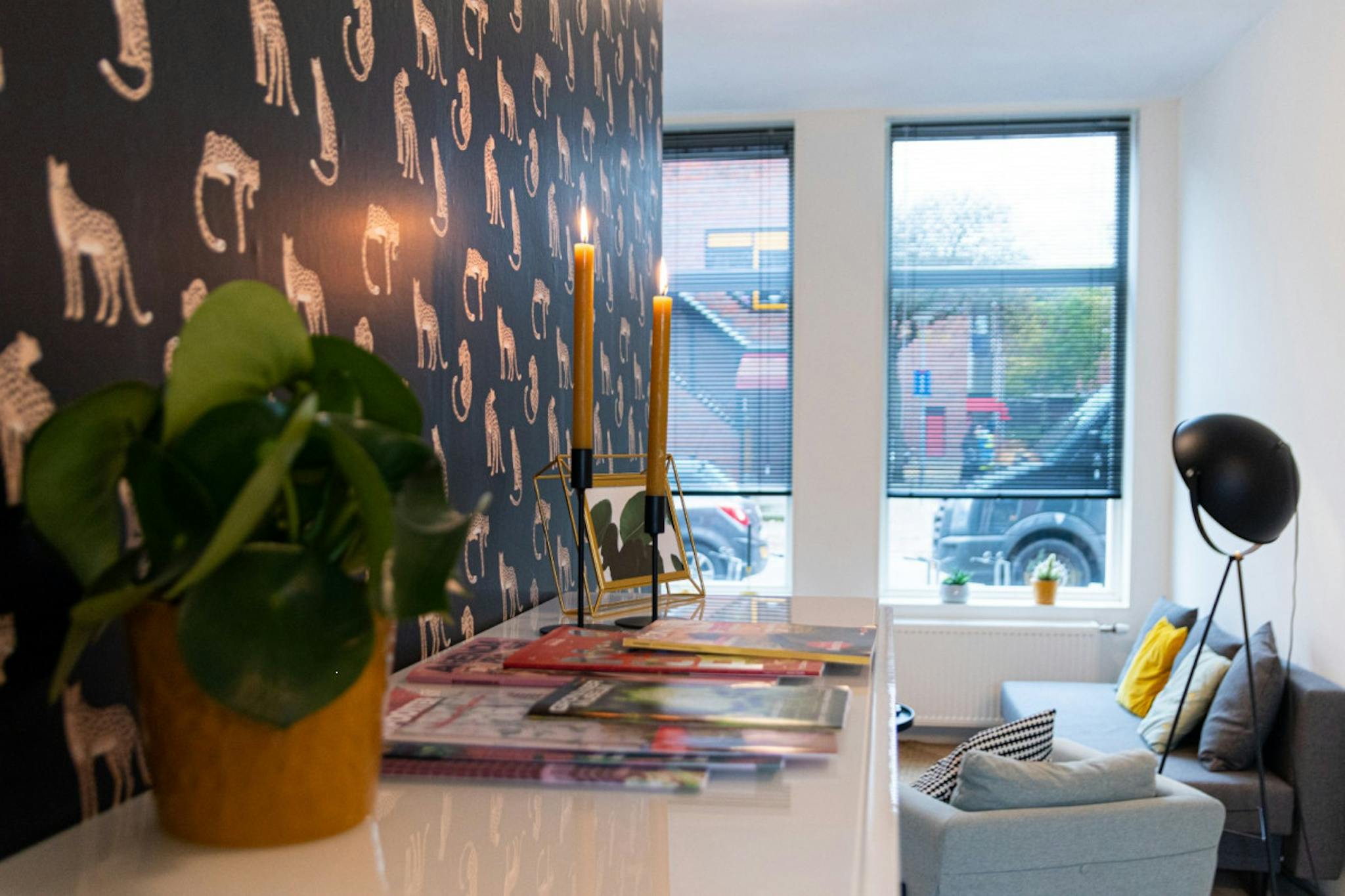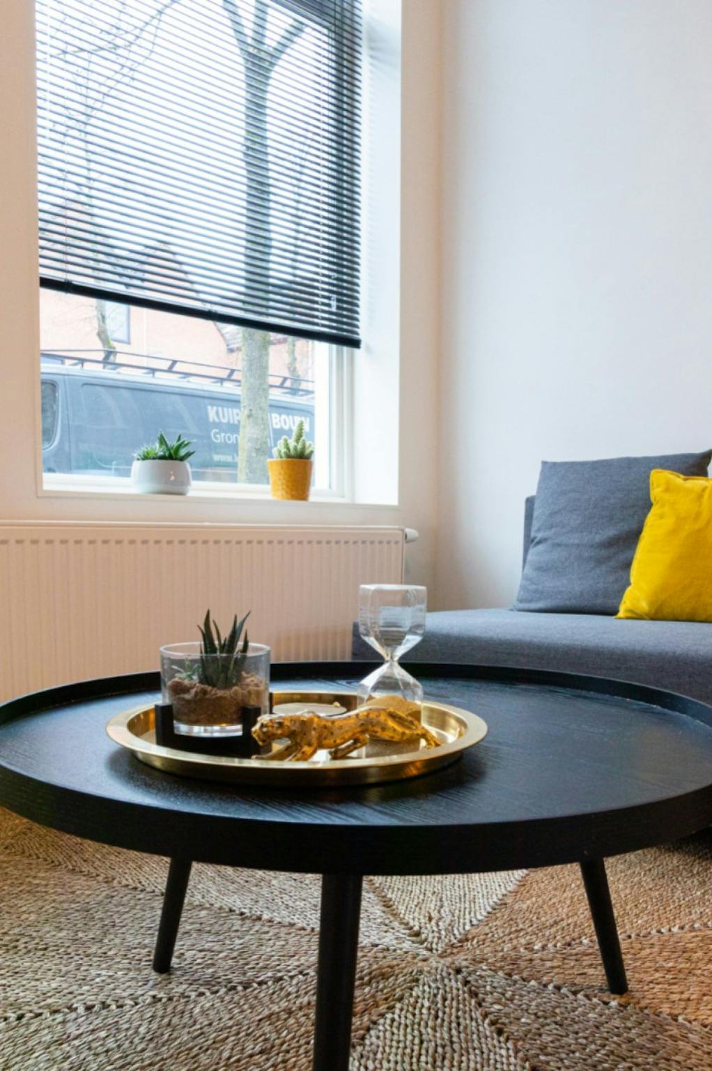 De woonkamer is modern ingericht met aan de straatkant een zithoek met slaapbank, grote stoel, 4K Smart TV en een opbergkast. In het midden van de kamer staat de keuken met nog een opbergkast. Het washok met een wasmachine en een droger bevindt zich tevens in het midden van de woonkamer. Aan de achterzijde van de woning is een eethoek met een hoge tafel + vier stoelen. Via schuifdeur komt men in het buitengedeelte met zithoek. De badkamer en slaapkamer bevinden zich aan de achterzijde van de woning.