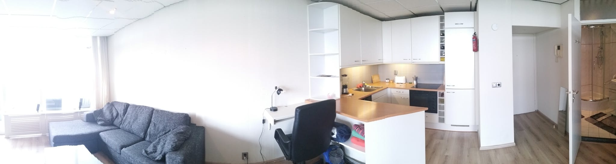 The living room has oversized windows, modern laminated flooring, recessed ceiling lighting, a coffee table, a sofa and connects to large terrace with the view of the city.The open kitchen equipped with the modern ceramic hob, built in combination microwave, a fridge and a Bosch dishwasher. The bathroom has white tiles with a shower and a modern toilet. A large bookcase separates the living room from sleeping area. The sleeping area has a double sized bed and a wardrobe.