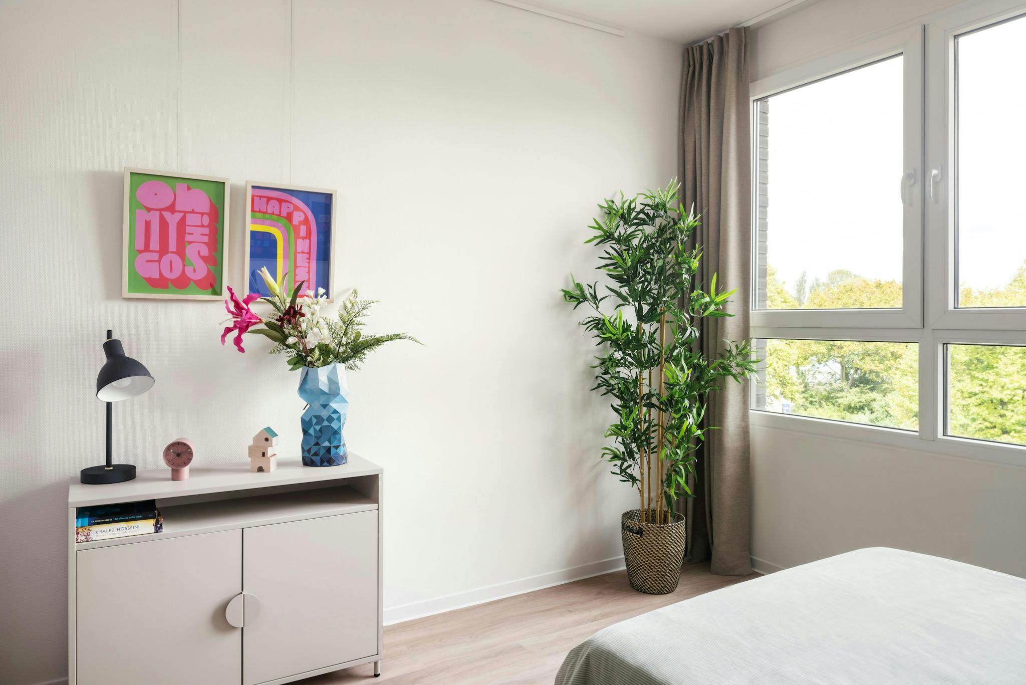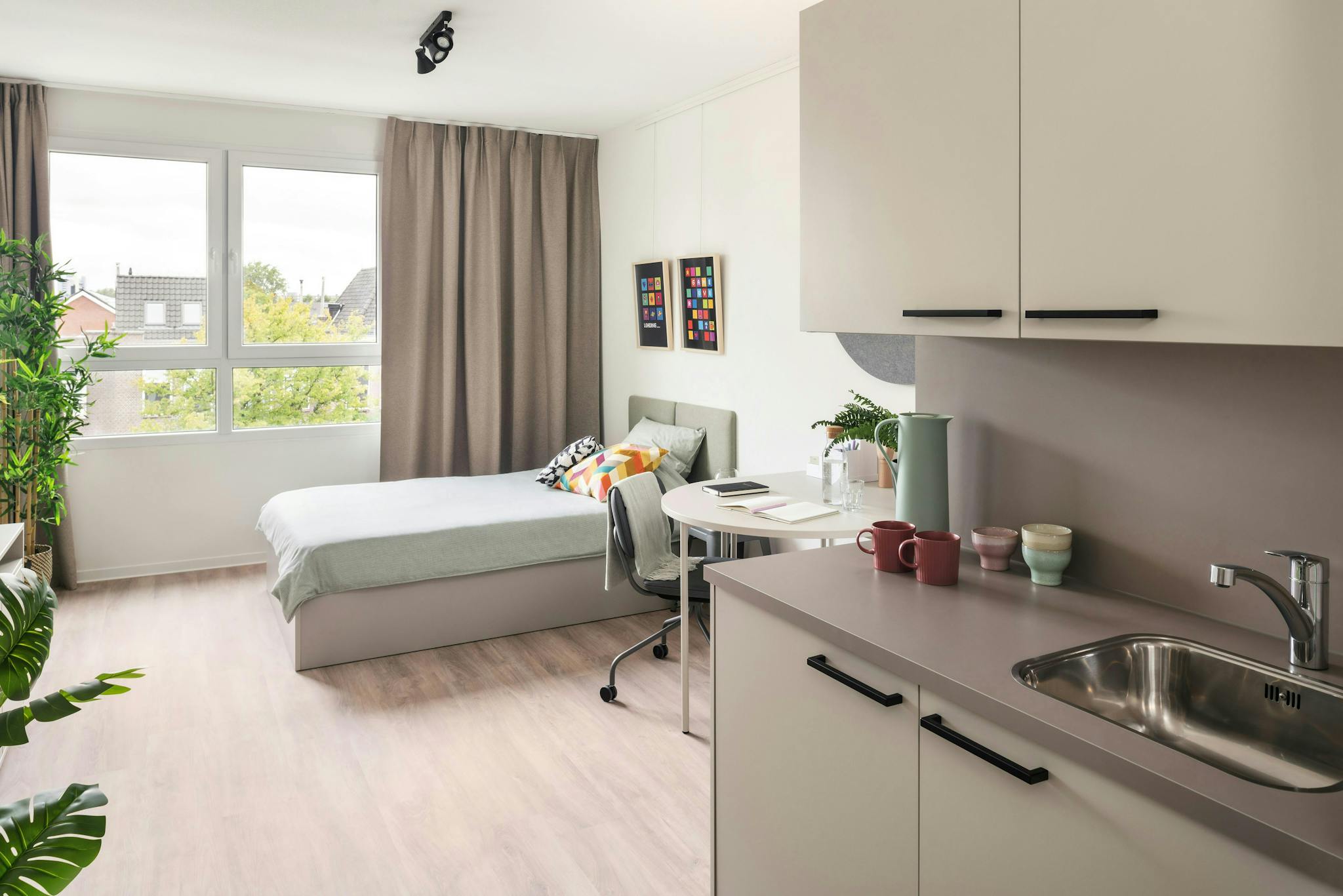 Your apartment offers you a cosy living area featuring a bed, incl. a mattress, a desk with a chair, a wardrobe with a mirror and generous storage spaces.