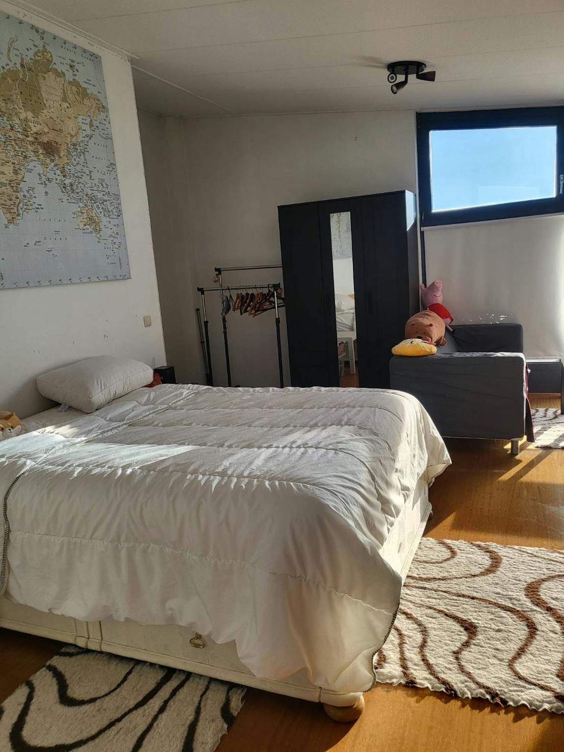 The room has a double bed, chair, book shelf, a hanger rack and four bed drawers.