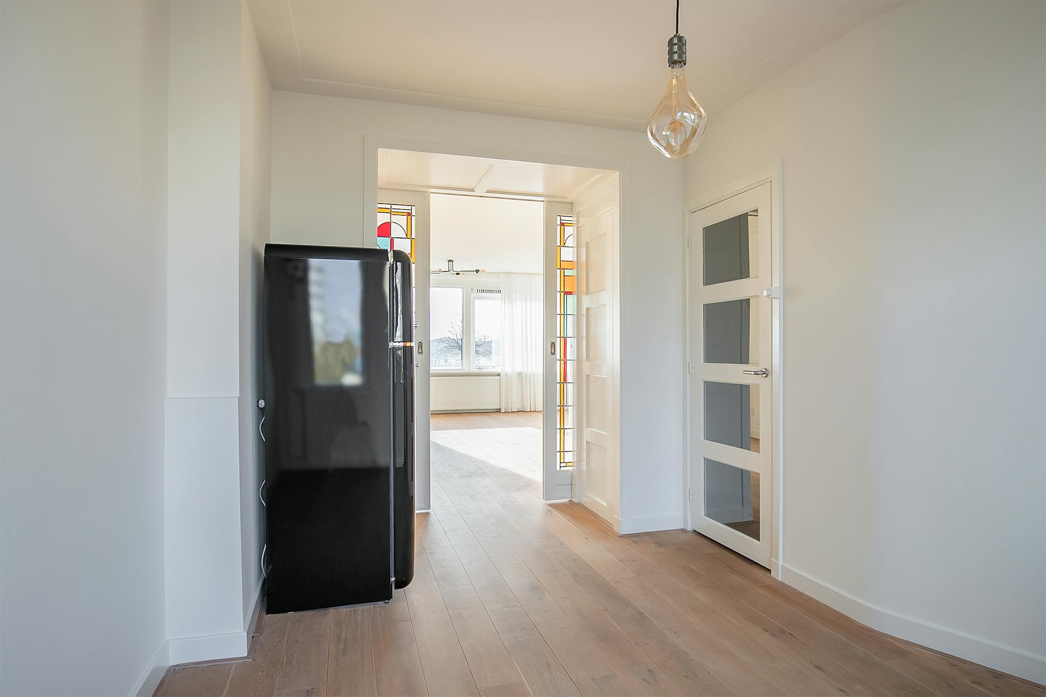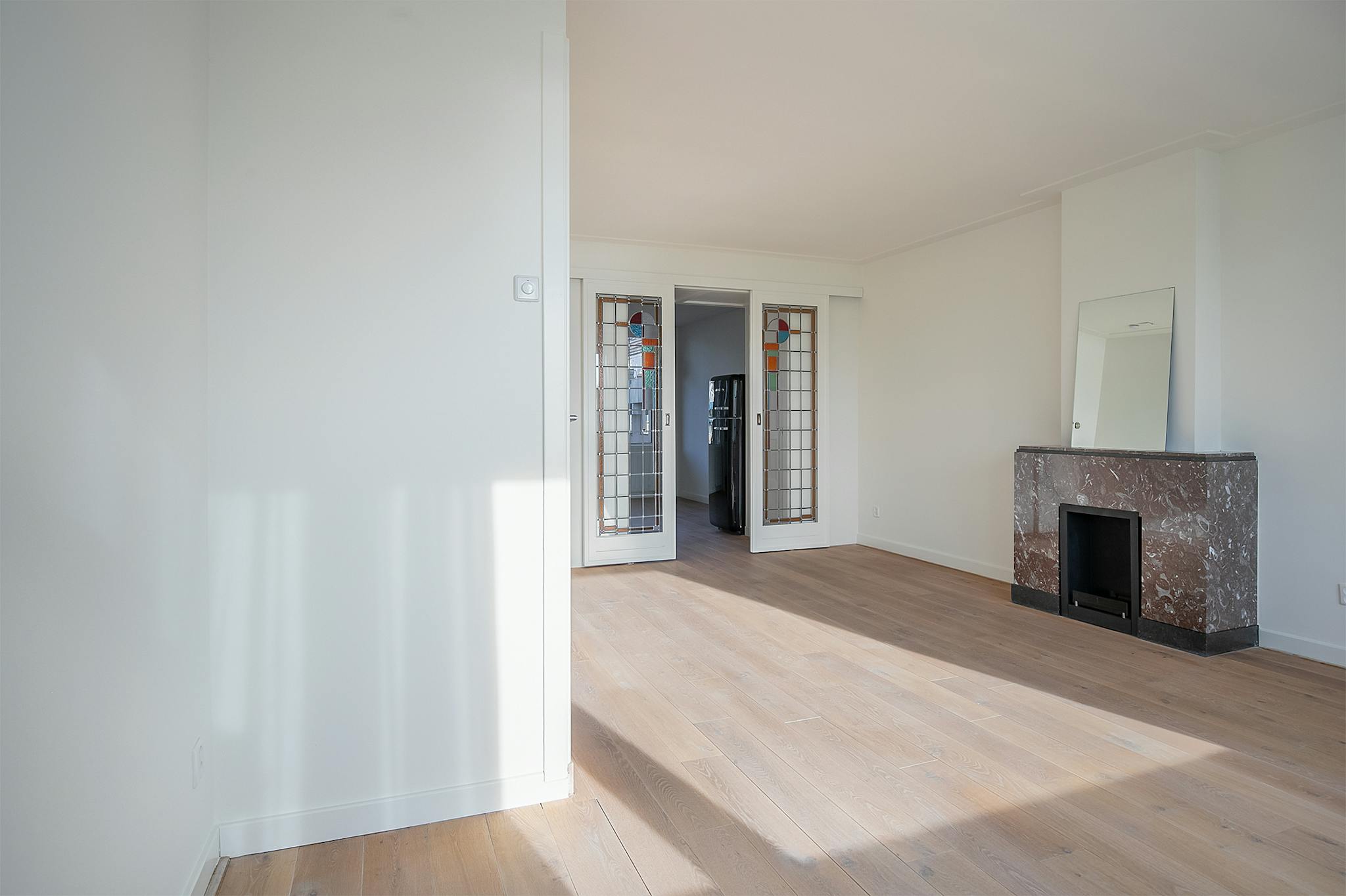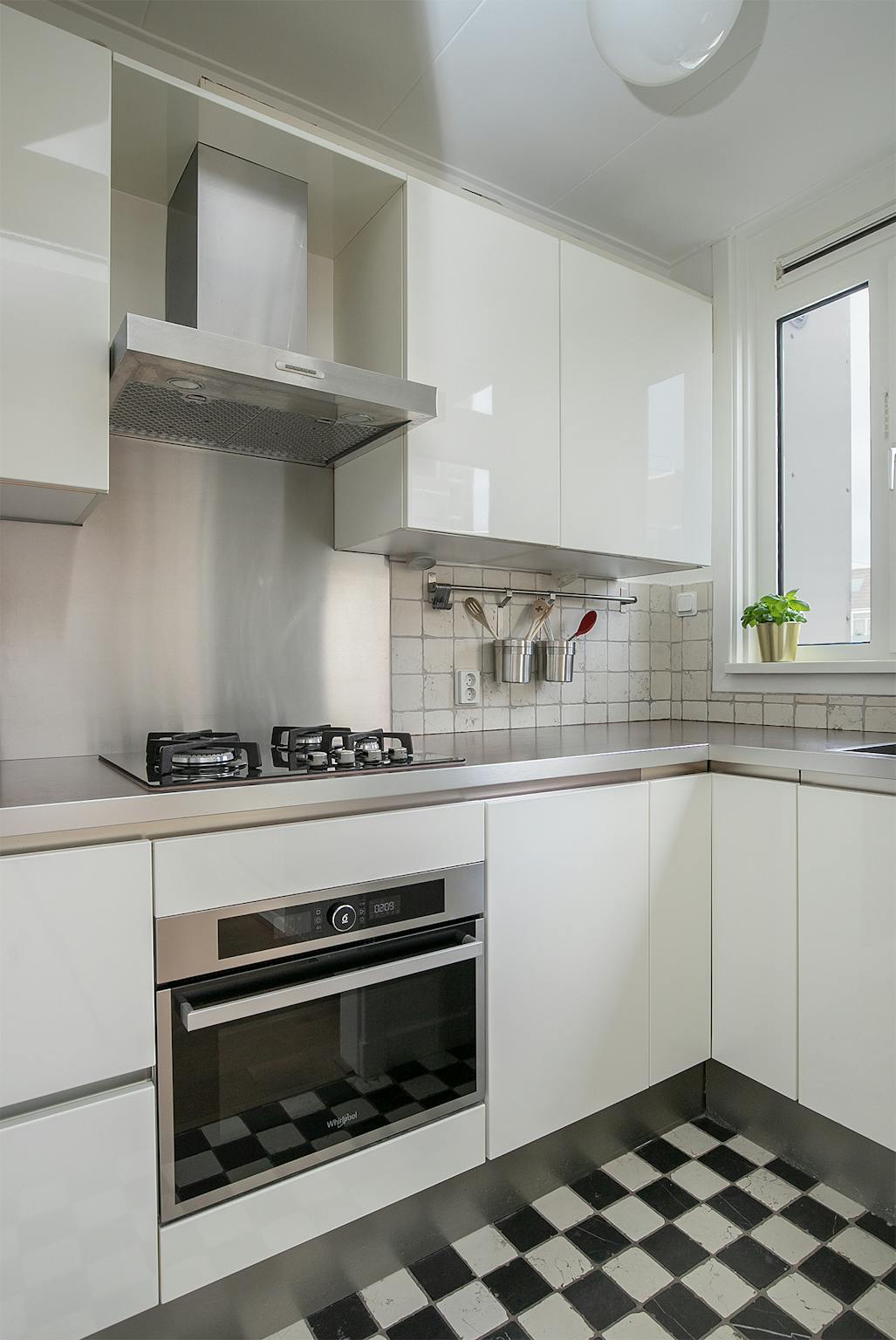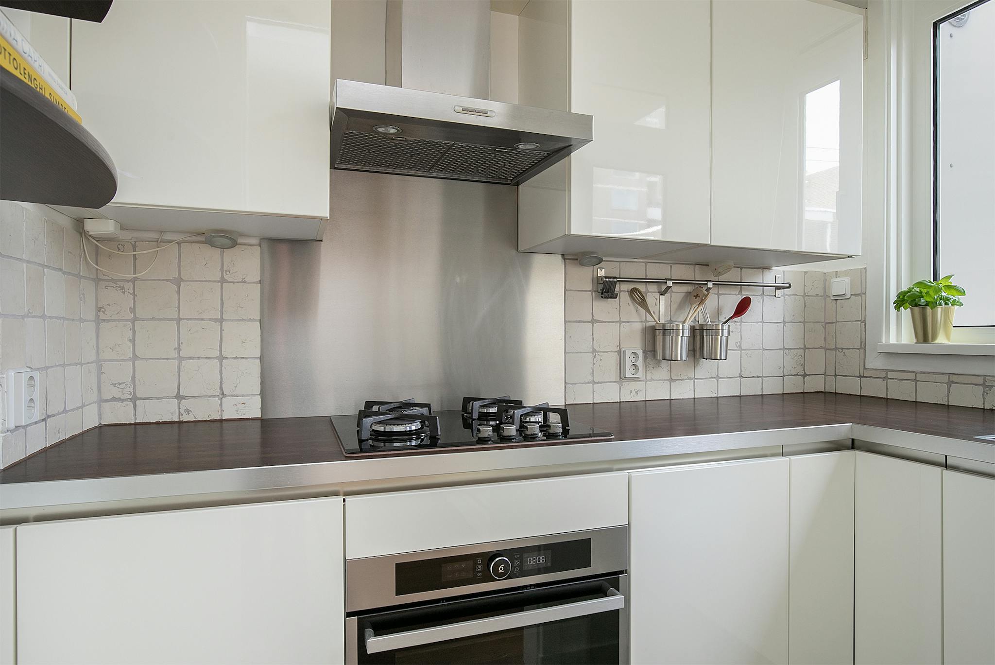 Through the well-kept entrance and staircase you will find a separate toilet with hand basin, after which access to the beautiful living room en suite, with a light wooden floor and a bio-ethanol fireplace, with access to the sunny north-facing balcony with a view of the courtyard. The sleek white kitchen with built-in appliances, including a 4-burner gas furnace, combi-oven, dishwasher and extractor hood, offers sufficient storage space. The window in the living room on the south side is also equipped with an electrically adjustable sunscreen.