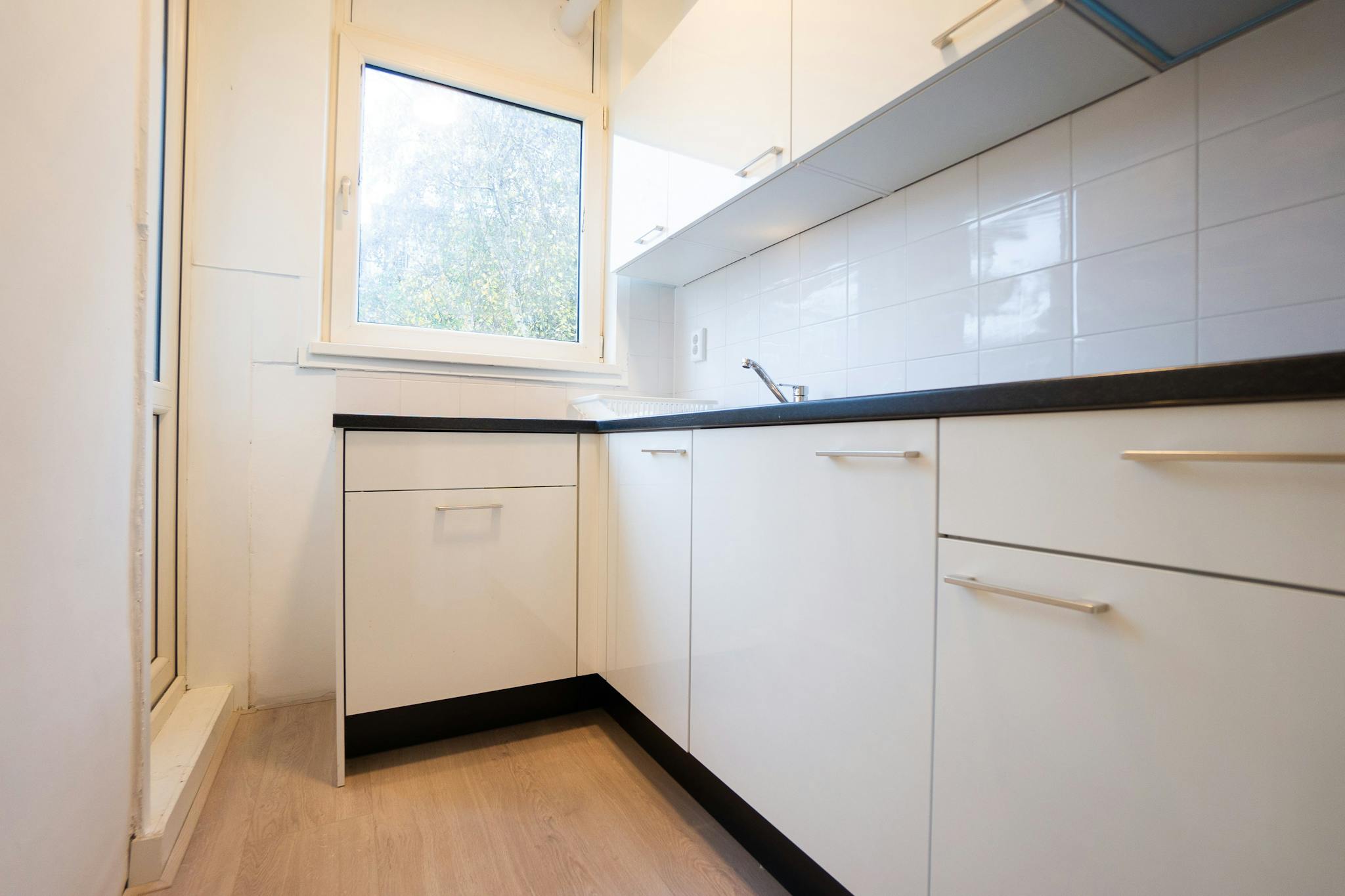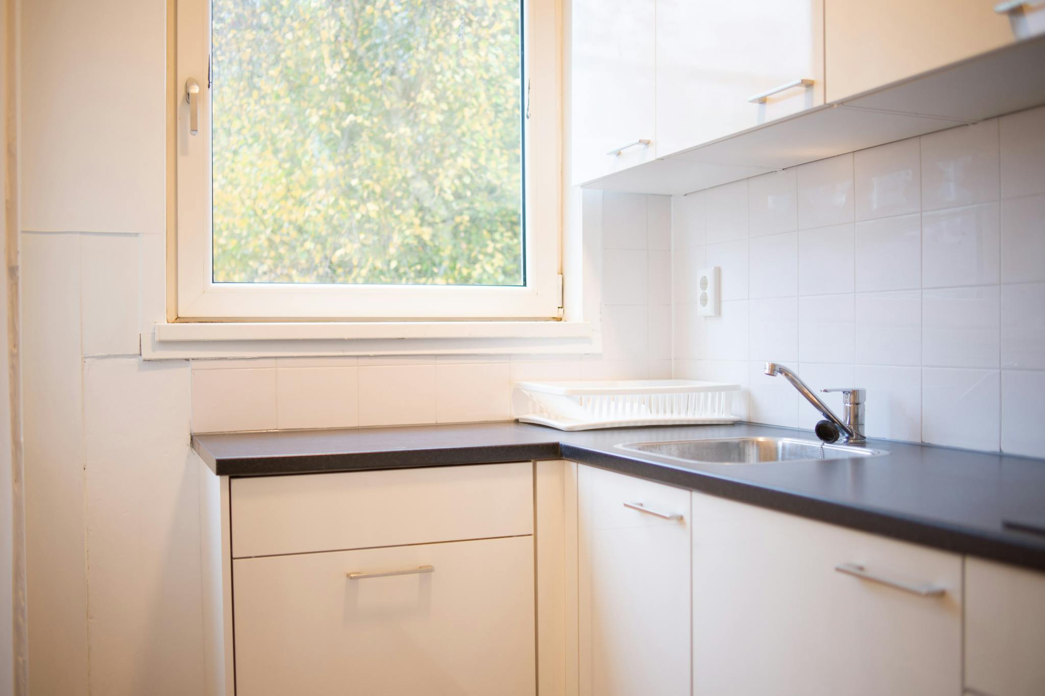 The room is located on the first floor at the front of the property. The room is approximately 20m2 and is very spacious. There is a nice alcove so you have a separate dining area. The studio feels very spacious due to the high walls.