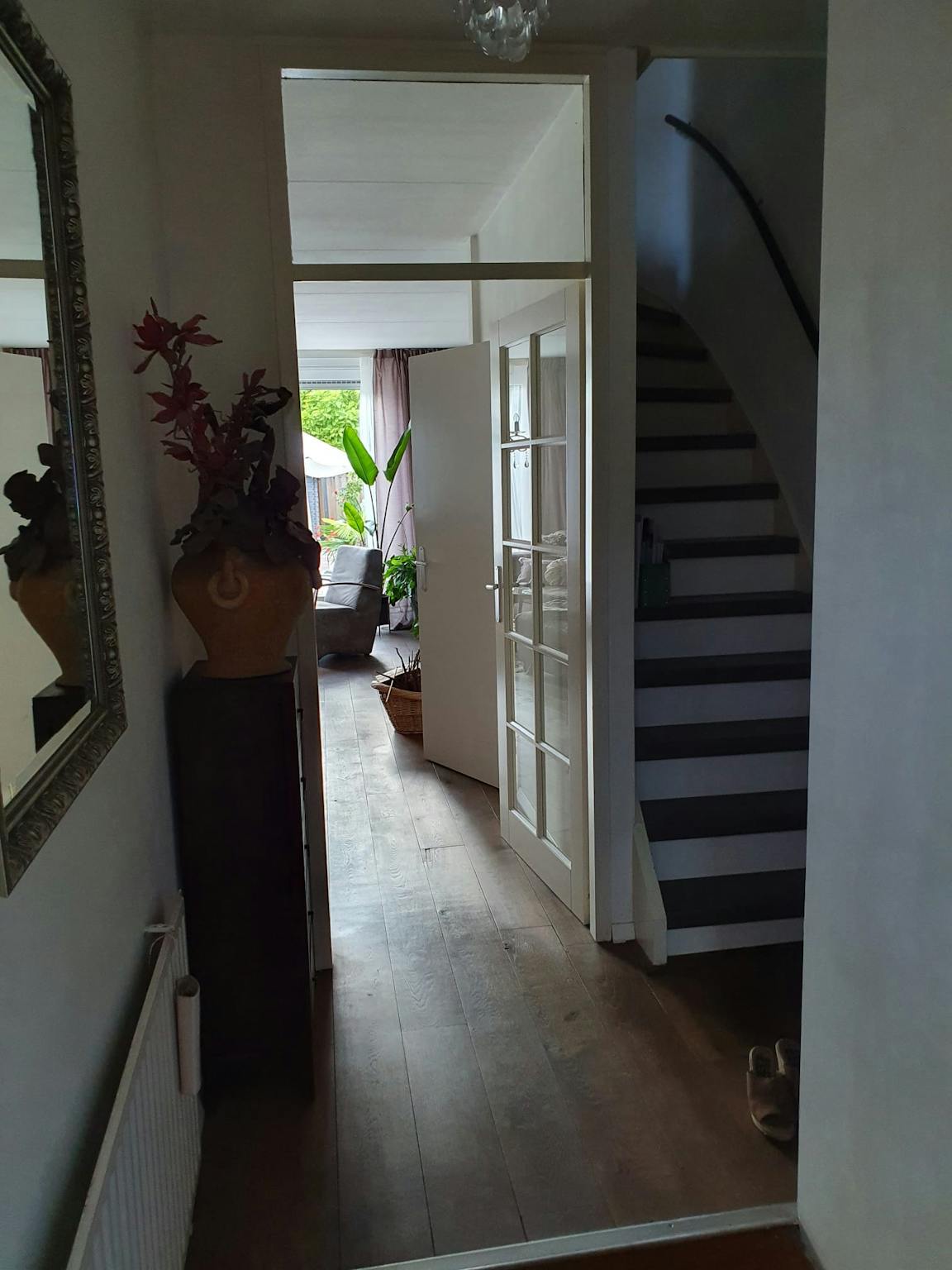 On the first floor there is the bathroom and 3 rooms. One room is the bedroom with a bed and closet with drawer, the 2nd rooms is a closetroom an the 3rd room is an unfurnished (bed)room