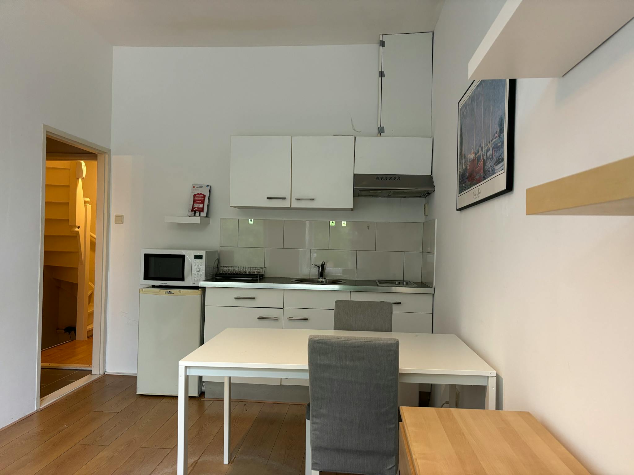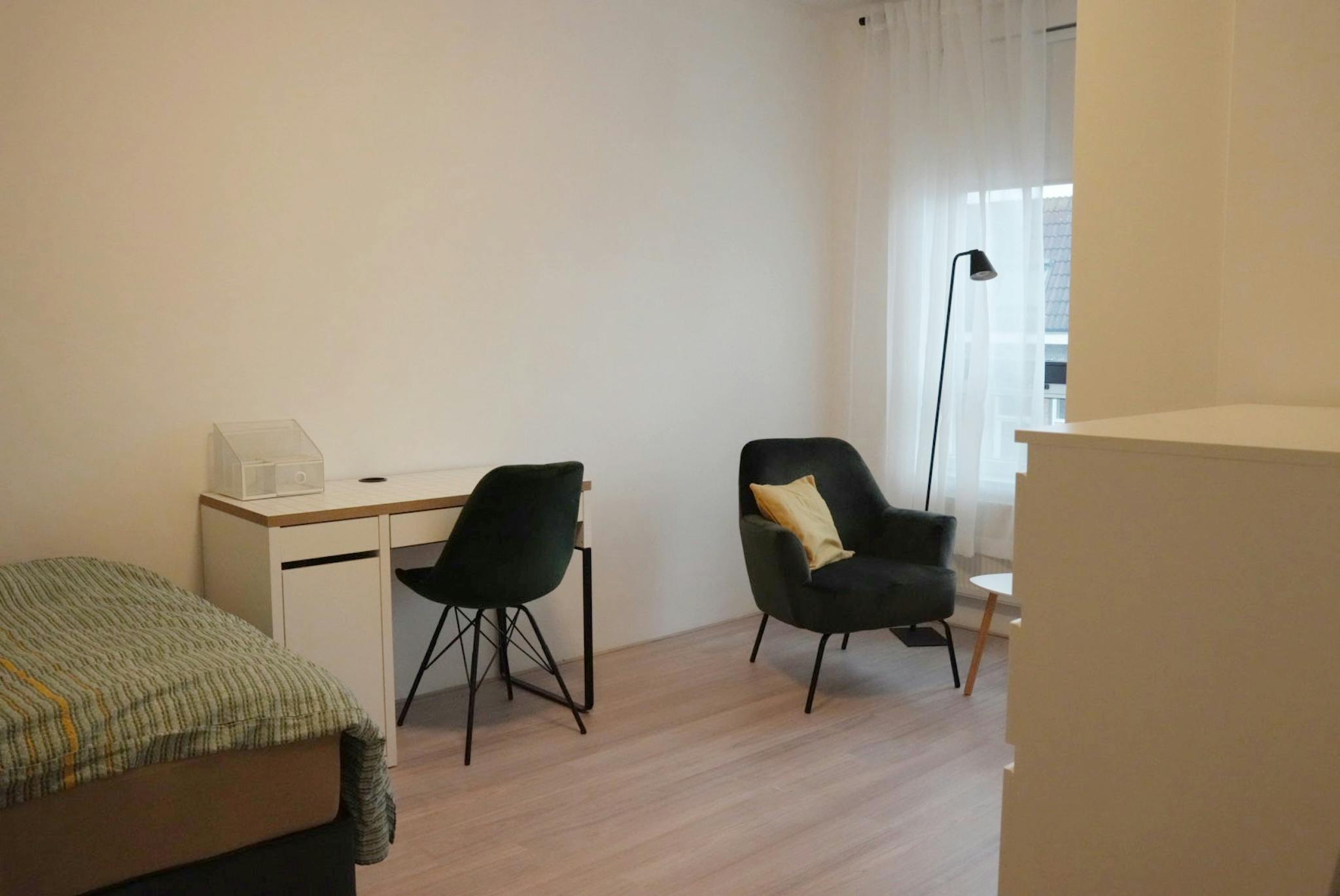 Furnished 22sqm studio, it is fully equipped and bright. The accommodation is fitted with a double bed, a comfy sofa, bathroom with a shower, a toilet and a small kitchen. In the house there are in total six studios/private rooms. In addition to the facilities in the studio, there are shared spaces in the house. The following shared features are available in the house: kitchen with dishwasher and dining table and chairs on ground floor, bathroom with shower on ground floor, washing machine and dryer on 2nd floor. WIFI is also included.
