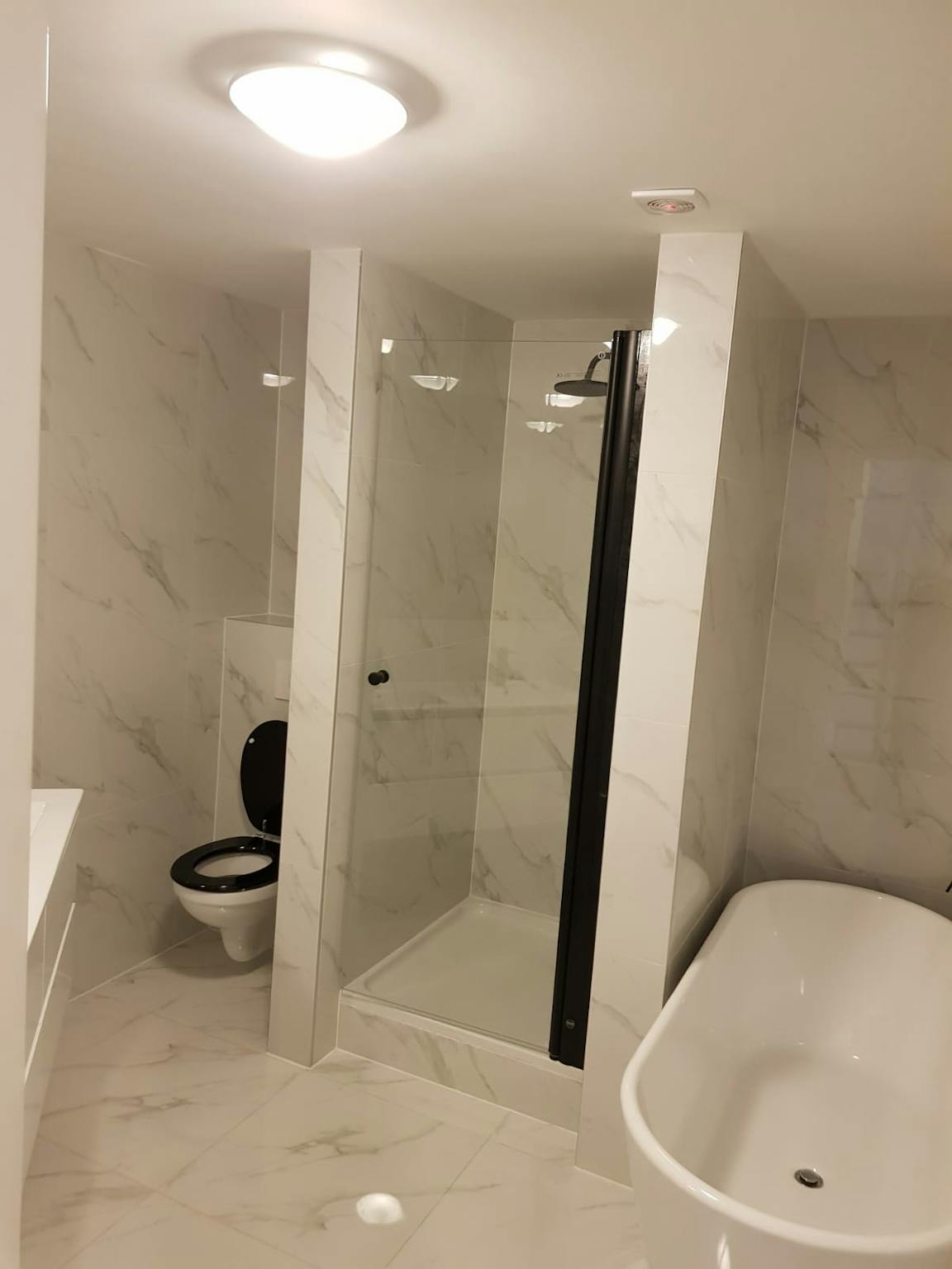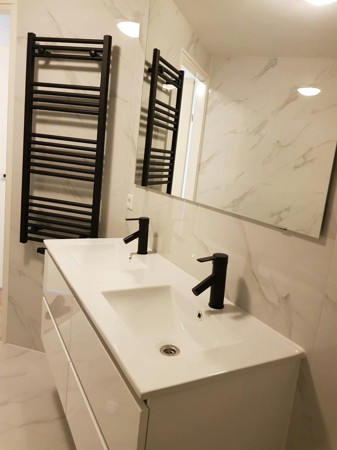 1 grote badkamer met douche, ligbad en dubbele wastafel op de 2e verdieping.