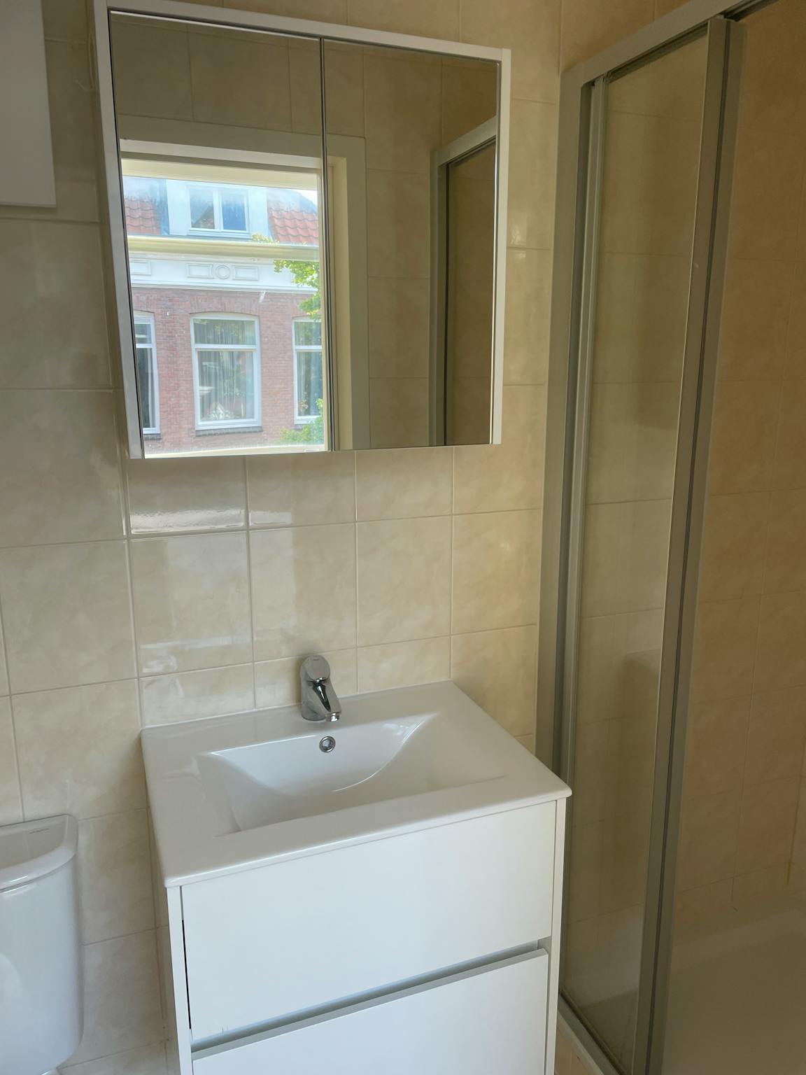 De lichte slaapkamer is voorzien van een tweepersoonsbed en verduisterende gordijnen. De badkamer heeft met douchecabine, wasbak en toilet.