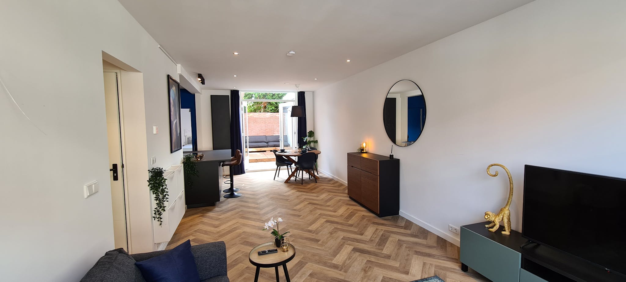 In the extension of the hall you will have the stylishly finished kitchen with all modern appliances (induction, oven, fridge/freezer, Quooker). through the kitchen also door to the garden/patio.