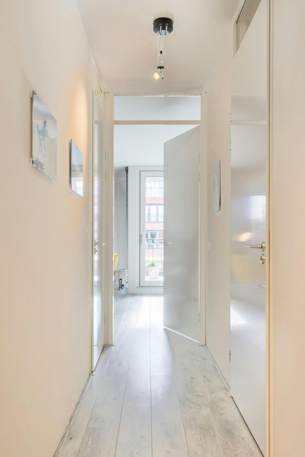 We komen binnen in de hal met meterkast en toegang tot de slaapkamers, badkamer, toilet en de woonkamer.